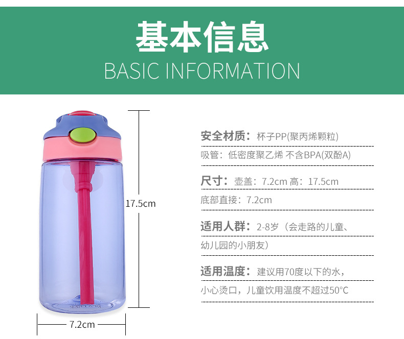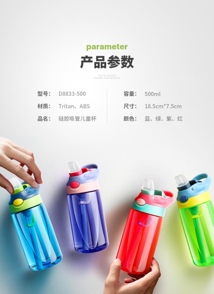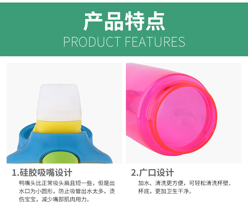 產(chǎn)品特點(diǎn):鴨嘴式兒童吸管塑料杯,防漏防溢,安全材質(zhì),一鍵喝水,5OOML容量,多種顏色選擇,寬口吸嘴喝水更流暢